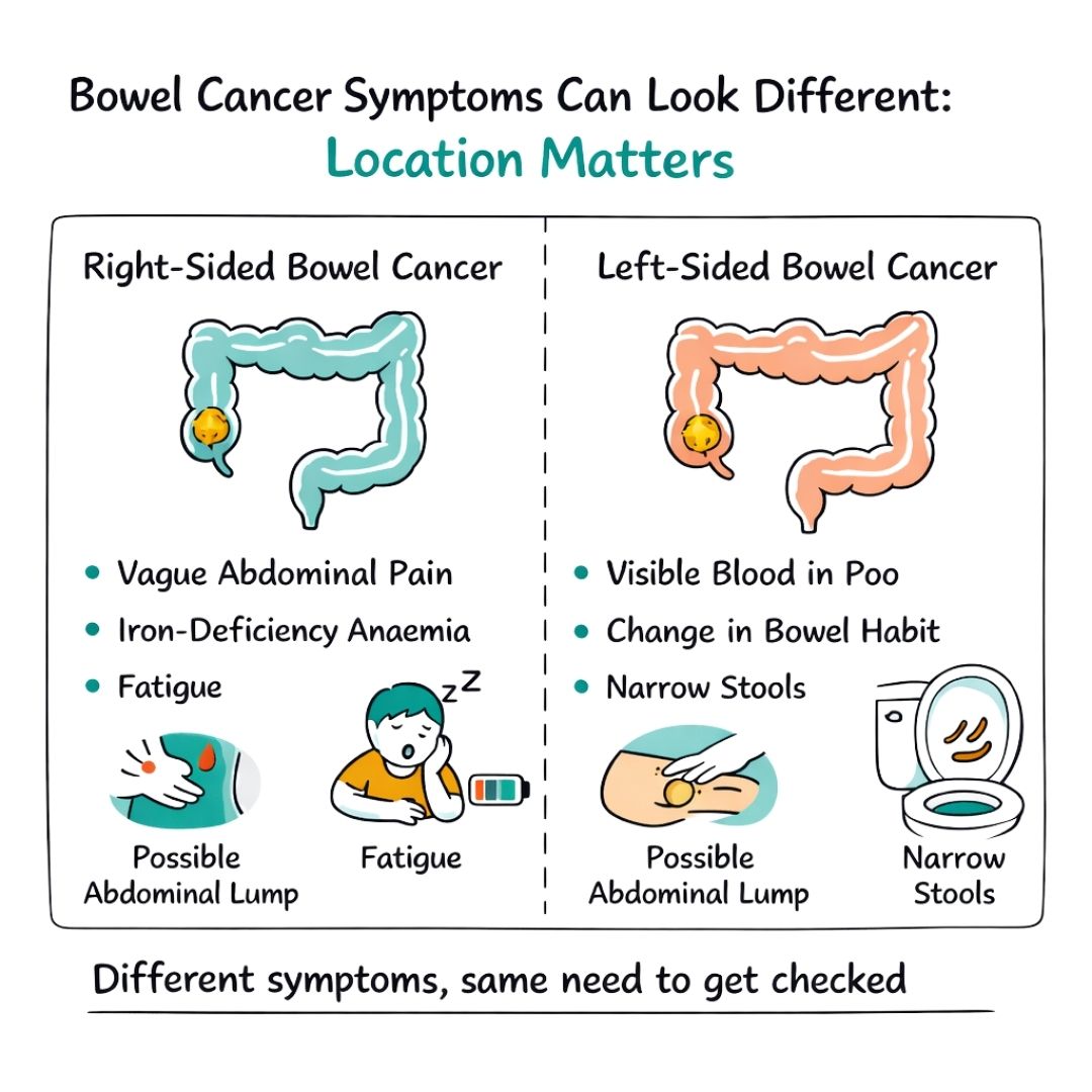 It’s also really helpful to understand that not all bowel cancers look and feel the same. The specific symptoms you experience can depend heavily on where in the bowel the tumour is actually growing. The large bowel is a long and winding tube, and a problem on one side can cause very different issues from a problem on the other.
