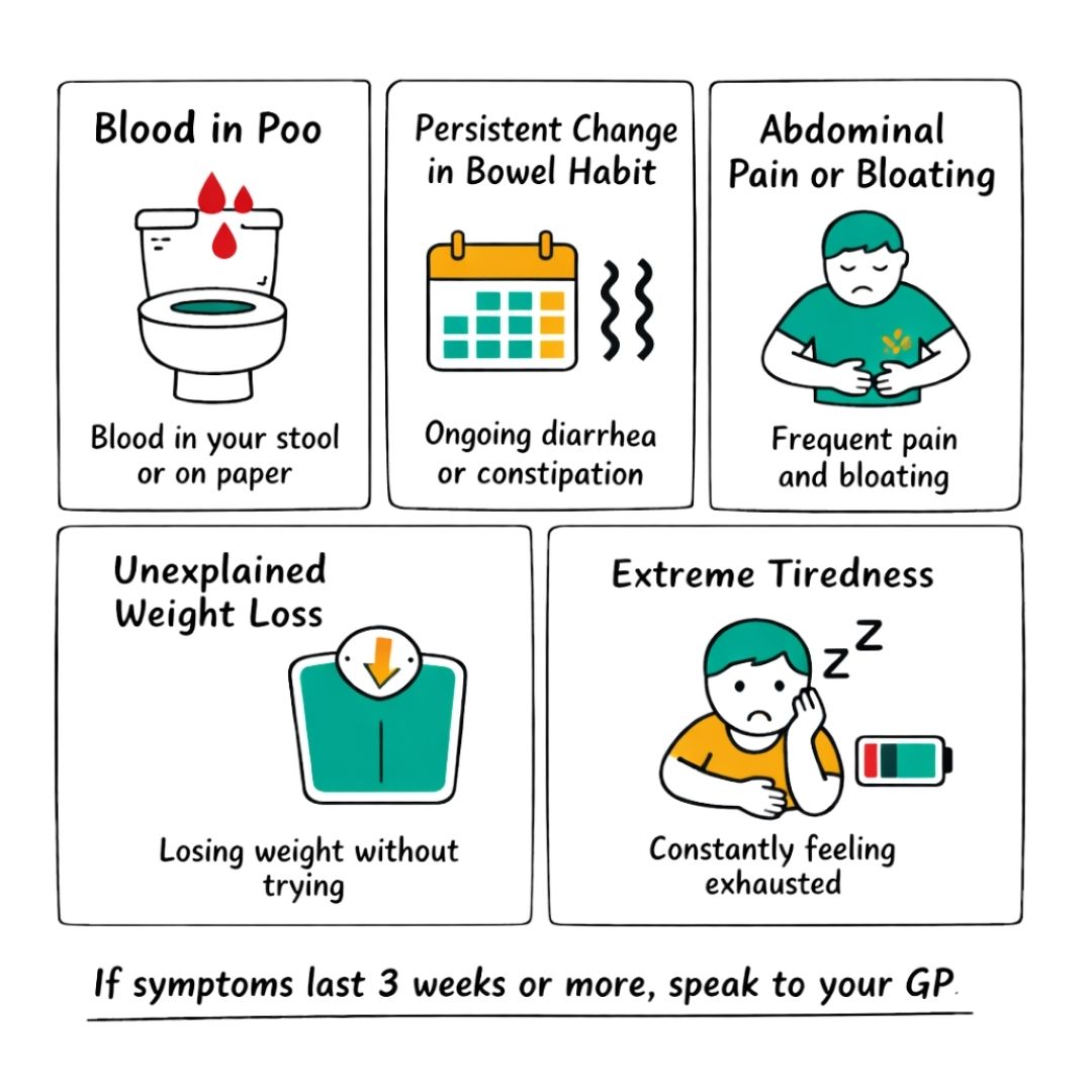 | A Persistent Change in Bowel Habit | Needing to go to the toilet more often, having looser stools (diarrhoea), or feeling like you haven't fully emptied your bowels. | A tumour can obstruct the bowel or affect its function, leading to noticeable and lasting changes in your normal toilet routine. |