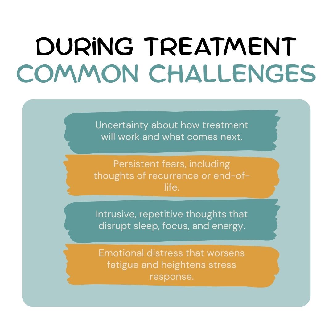 - Fear of what comes next, including thoughts about recurrence, even while still in treatment. Repetitive thoughts about unsuccessful or unexpected outcomes and how you and your loved ones might react and cope in that situation.