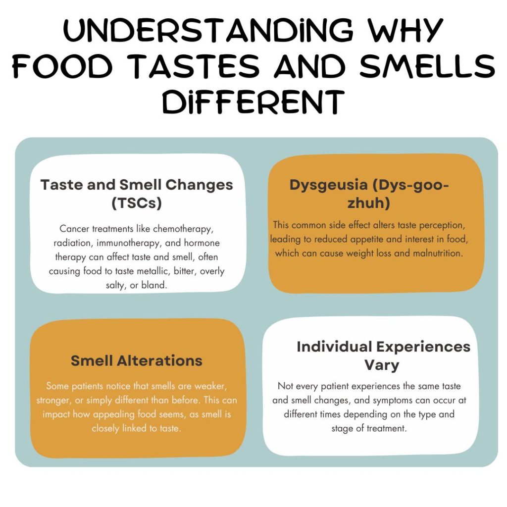 If you are navigating changes in taste and smell during cancer treatment, please know that you are not alone, and there are strategies that can help. Eating might feel hard right now, but small changes can make a big difference in how you feel. With the right support, it can get easier to eat well and stay strong, both mentally and physically.
