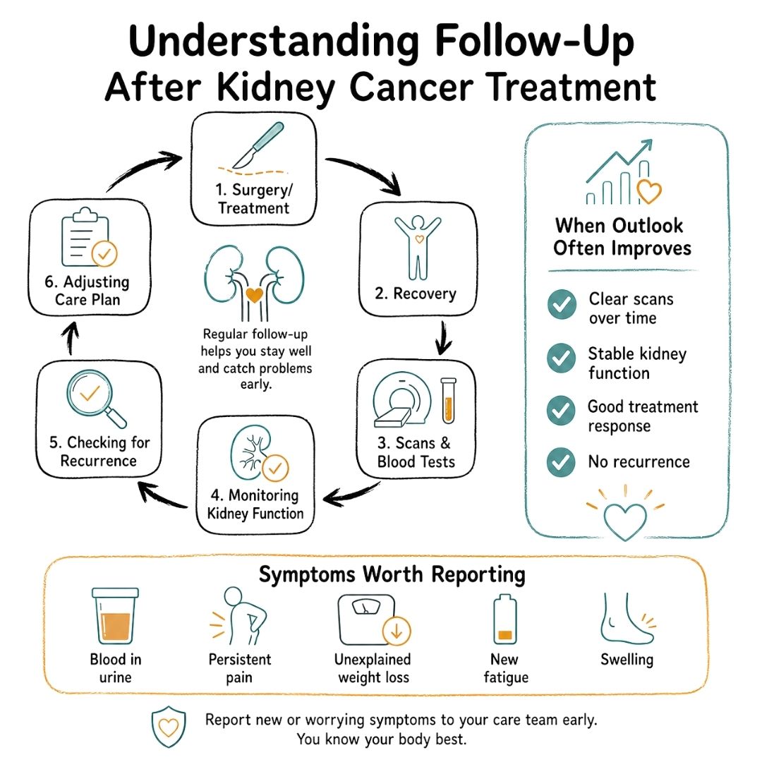 Doctors use follow-up appointments to look for signs that the cancer has returned, to monitor kidney function, and to manage ongoing effects of treatment. The schedule depends on your original cancer, the treatment you had, and how high or low your recurrence risk appears.