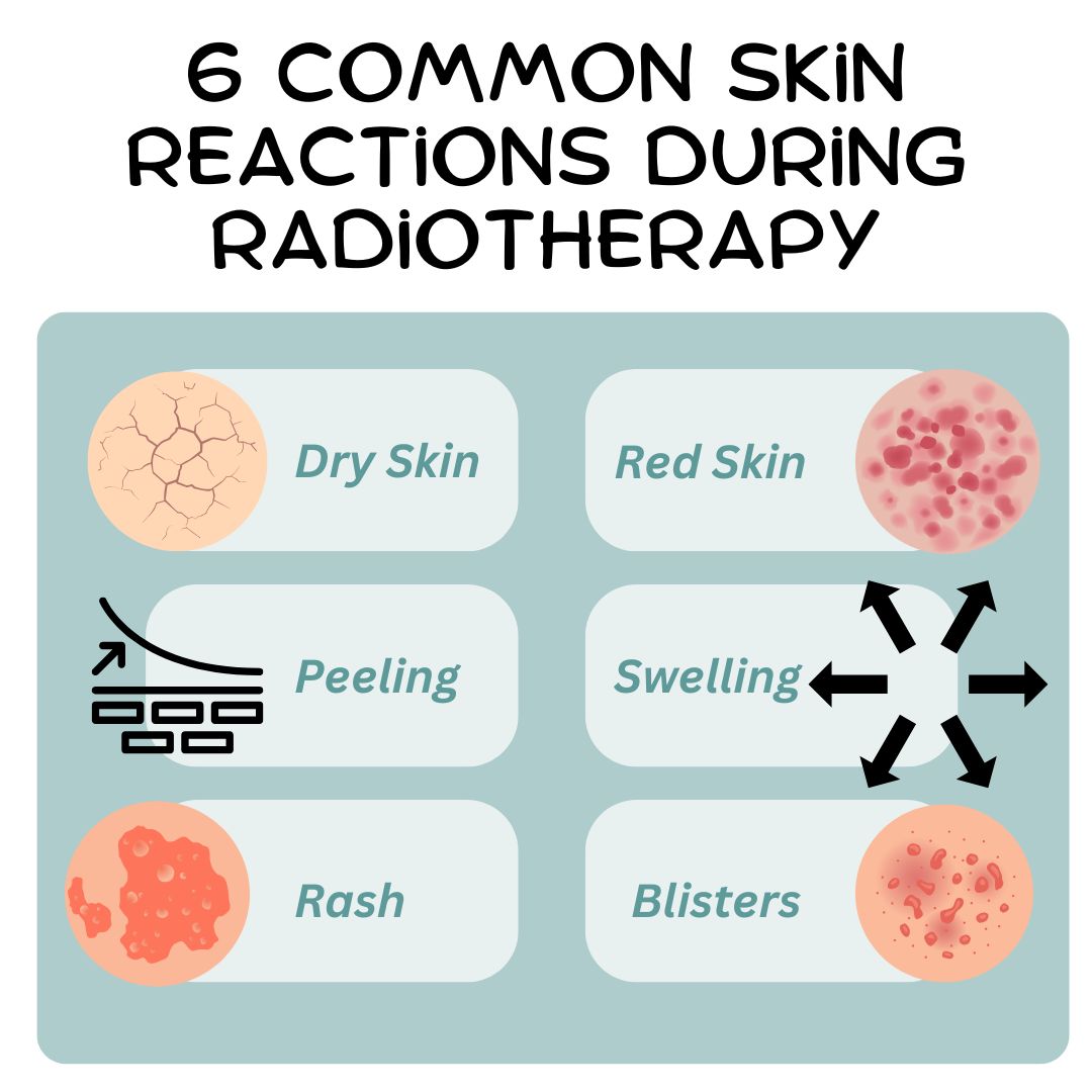 As mentioned above, during radiation therapy, the skin in the treatment area can experience a variety of reactions, called radiation dermatitis. The type and severity of these reactions can vary depending on the individual and the dose and duration of the radiation therapy.