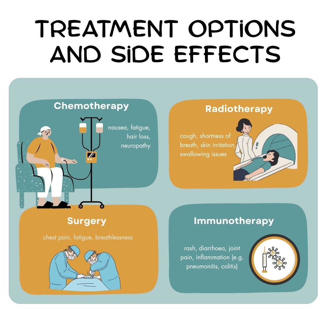 The main treatments are chemotherapy, immunotherapy, radiation therapy, and surgery. Below are some of the symptoms to expect if you choose to receive any of these treatments: