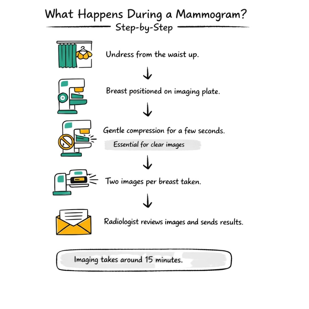 The whole thing is surprisingly quick. A standard screening mammogram usually takes less than 15 minutes for the imaging itself, with the total appointment lasting about 30 minutes.