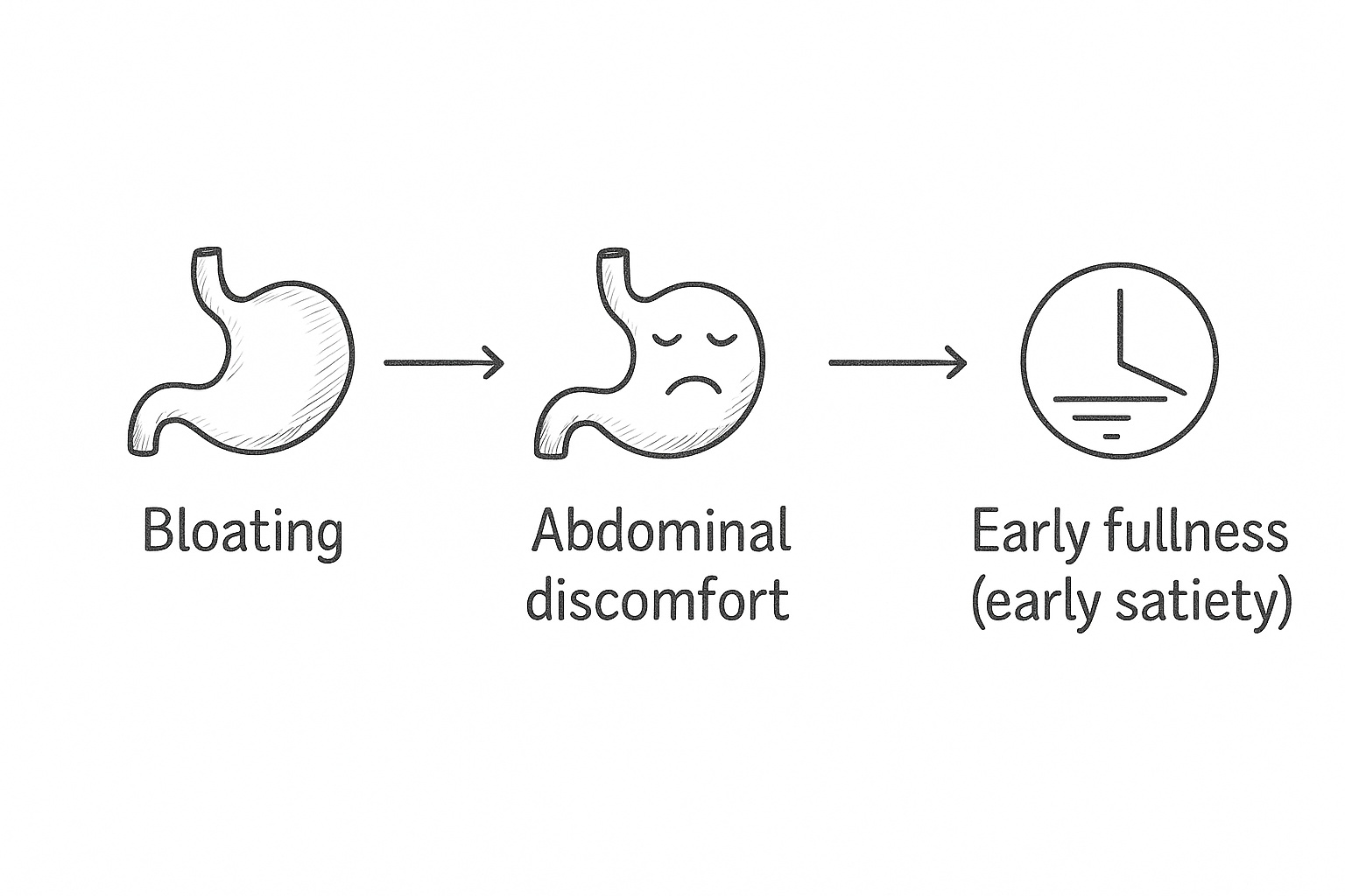 | Feeling Full Quickly | Eating rich foods, stress, or eating too fast. | This happens with almost every meal, even small ones, and you may also be losing weight without trying. |