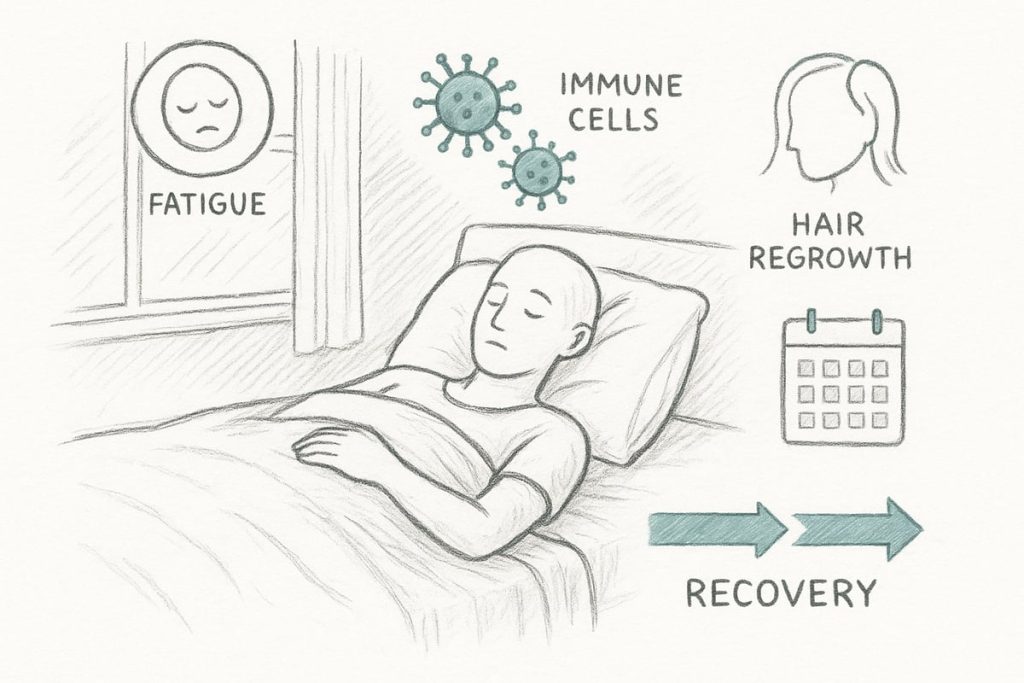 During recovery from chemotherapy, fatigue is the most common side effect, affecting up to 80% of patients. You might also notice tingling in the hands or feet (neuropathy), digestive issues like nausea or diarrhoea, and visible changes to hair and skin. Each person's experience can vary, but these symptoms often linger for weeks or even months.