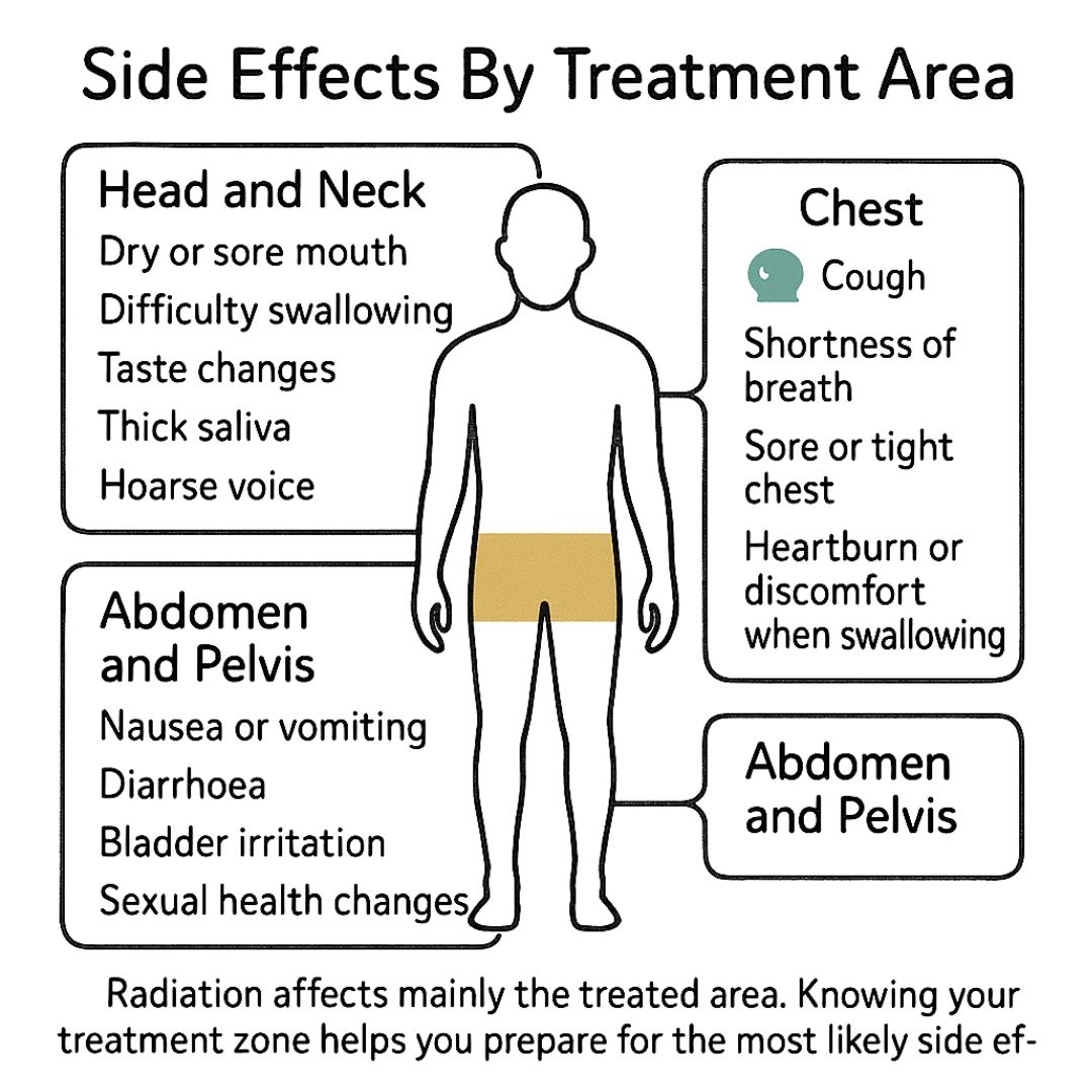 If your treatment is focused on the chest for something like lung or oesophageal cancer, it can temporarily affect the nearby organs. Because this area is home to your lungs and food pipe, the side effects usually relate to breathing and digestion.
