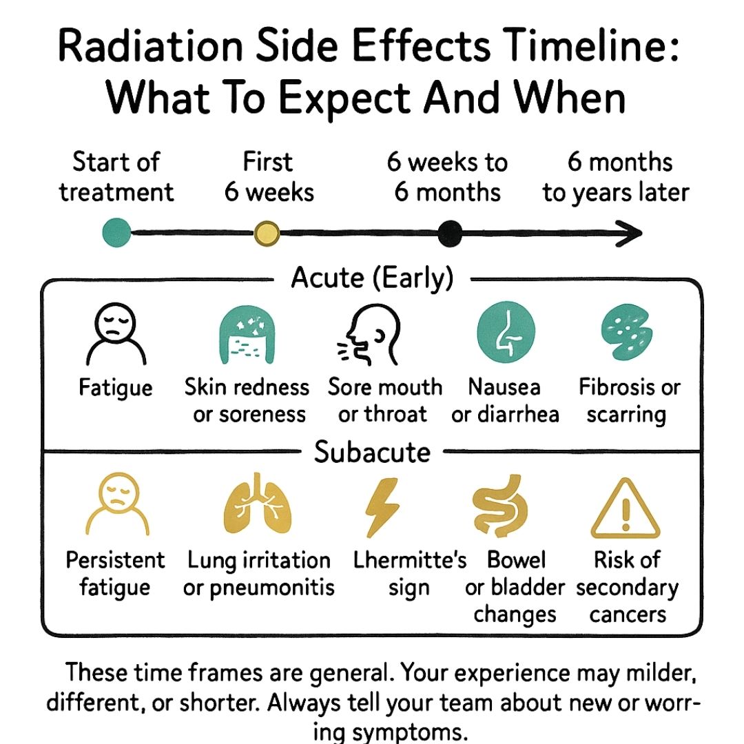 | Late (Chronic) | 6 months to many years after treatment | Fibrosis (scarring), lymphoedema (swelling), secondary cancers, heart or lung damage, bowel or bladder issues | Can be long-term or permanent, but are often manageable |