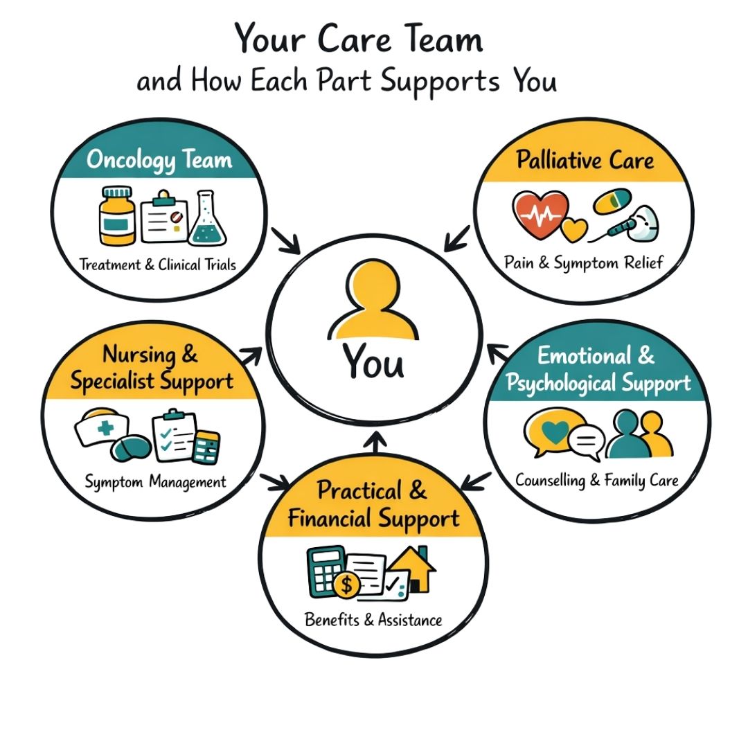 A palliative care team is a group of different experts, usually including doctors, nurses, and social workers, who all specialise in managing symptoms and providing support. They’ll work closely with you, your family, and your oncology team to build a plan that looks at the whole picture.