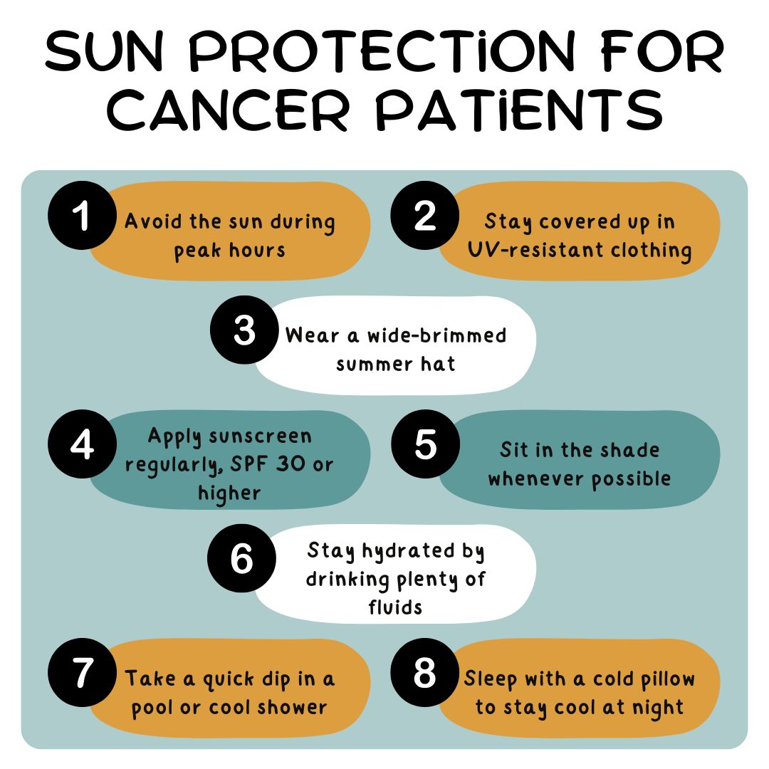 Not only can cancer treatment make the skin sensitive, it can also make you prone to fatigue. Staying hydrated will help to keep you alert and awake in hot weather. Drink lots of liquids, and try eating fresh fruit to keep your fluid levels up. It will also help to keep you cool.