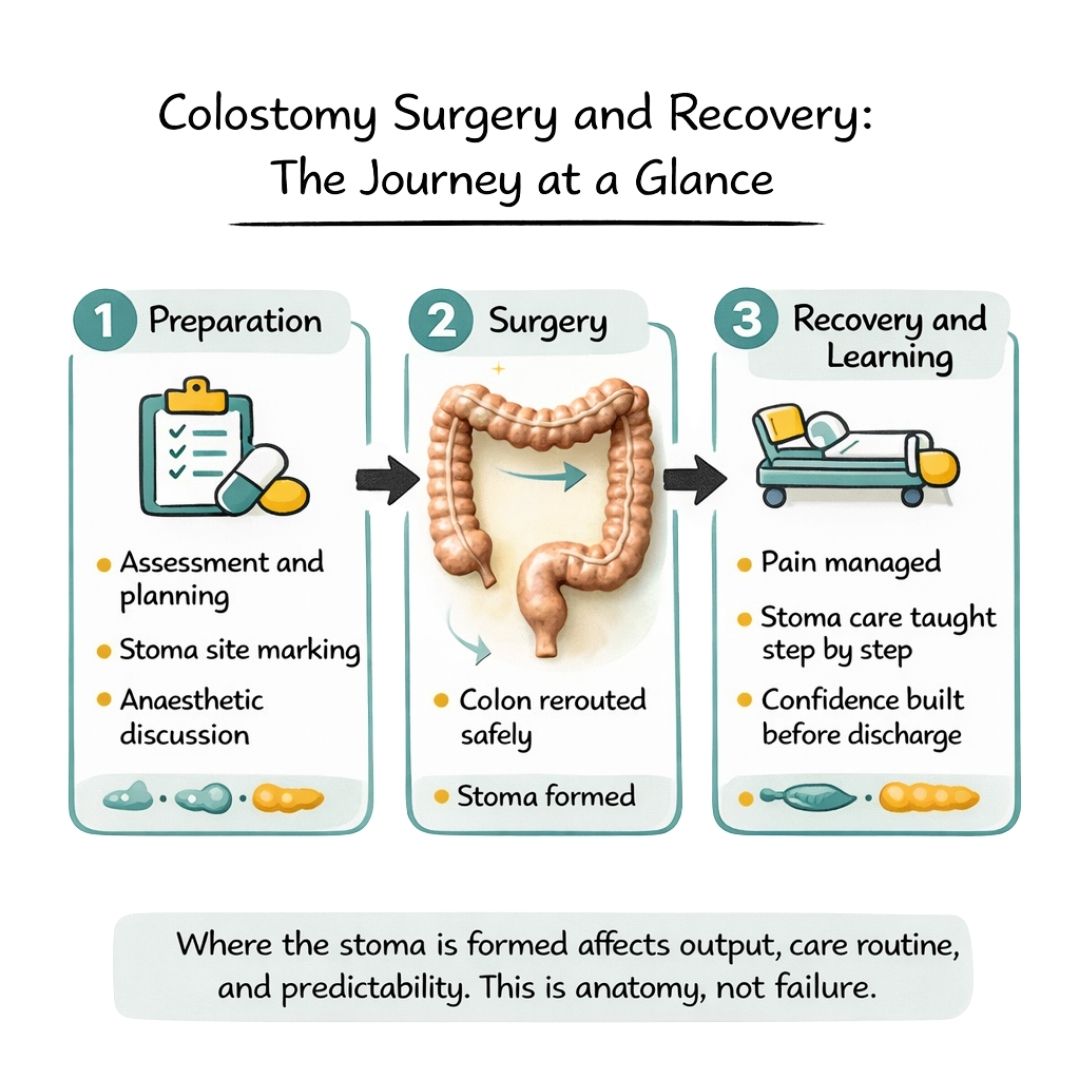 When you wake up, you’ll be in a recovery room for a little while before heading to a hospital ward. It’s normal to feel quite tired and a bit sore, but the nursing team will be right there to manage any discomfort and keep you comfortable. You’ll notice a clear colostomy pouch is already fitted over your stoma, which allows the nurses to keep a close eye on it.