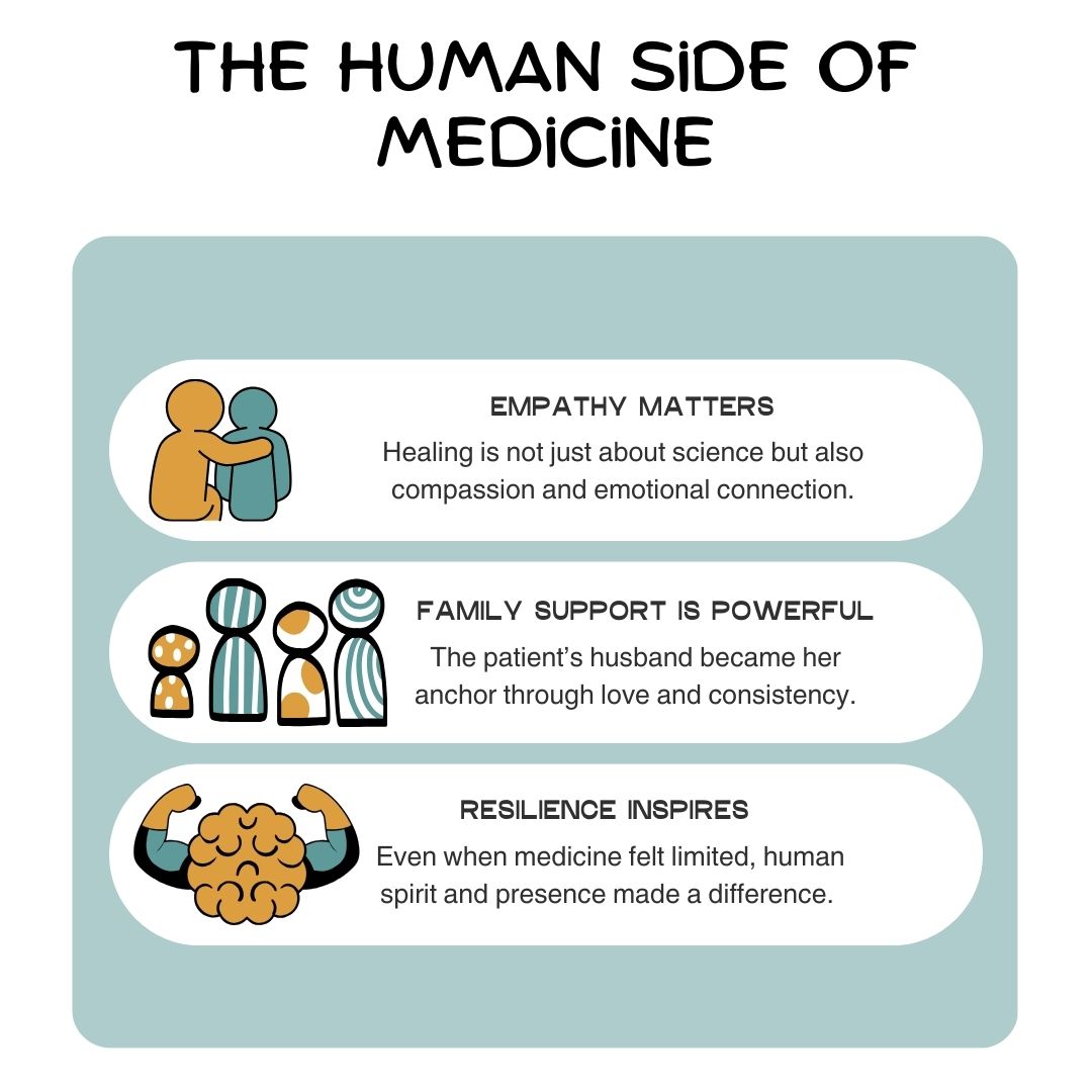 On the morning of the surgery, I remember seeing her sitting beside her husband, who was gently holding her hand. His eyes filled with emotion, grief, worry, love, and a desperate need to stay strong. He comforted her with quiet, reassuring words, trying to mask his tears and fear. He helped her believe that everything would be okay, even though the weight of uncertainty hung heavily in the air around them. That moment, their shared silence, the way he brushed her hair back, the way he whispered hope into her ears, remains one of the most human moments I have witnessed in medicine. In the absence of her parents, her husband was her whole world, her only anchor in a terrifying storm that she had to face.